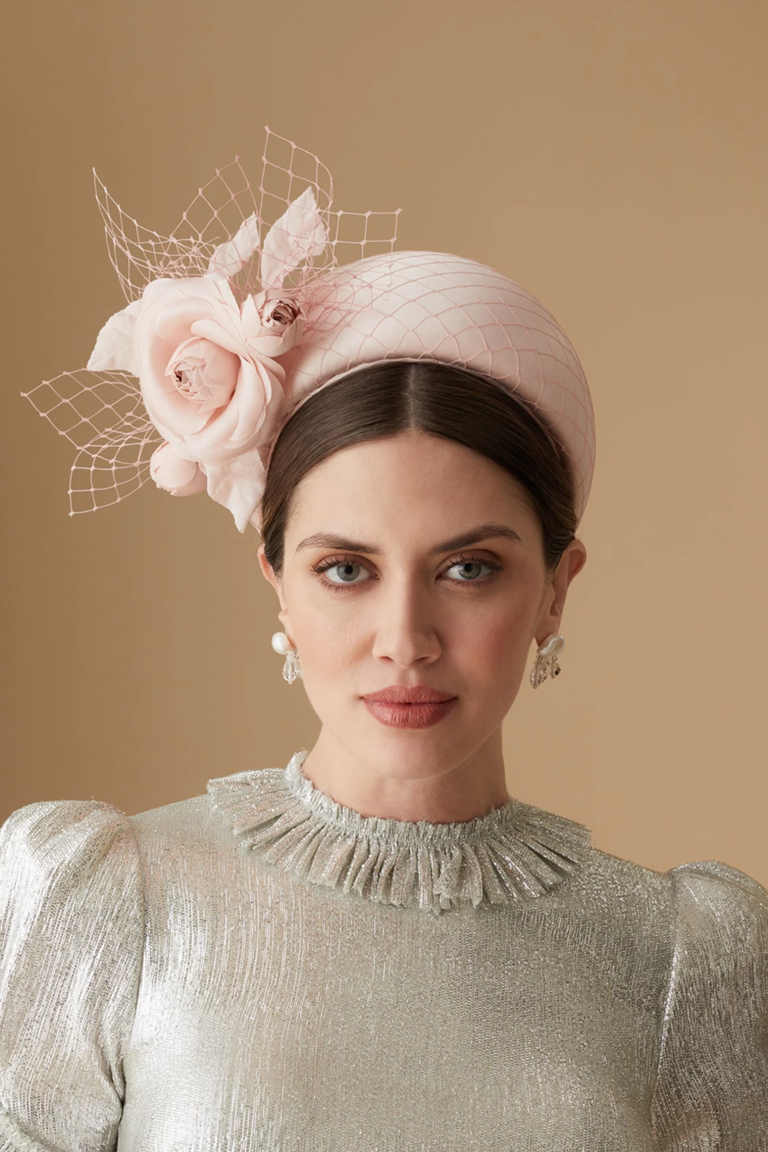 Introducing this glamorous pale pink headband, a luxurious accessory that effortlessly combines elegance with modern sophistication. Crafted from 100% pale pink crepe-back satin and veiling, this headband boasts a beautifully blocked design, exuding timeless charm and refinement. Adorned with a delicate satin camellia and veiling trim in the same base colour, this headband adds a touch of understated glamour to any ensemble. Designed to meet the strict dress code requirements of the Royal Enclosure at Royal Ascot, this headband ensures compliance while exuding a sense of regal sophistication.