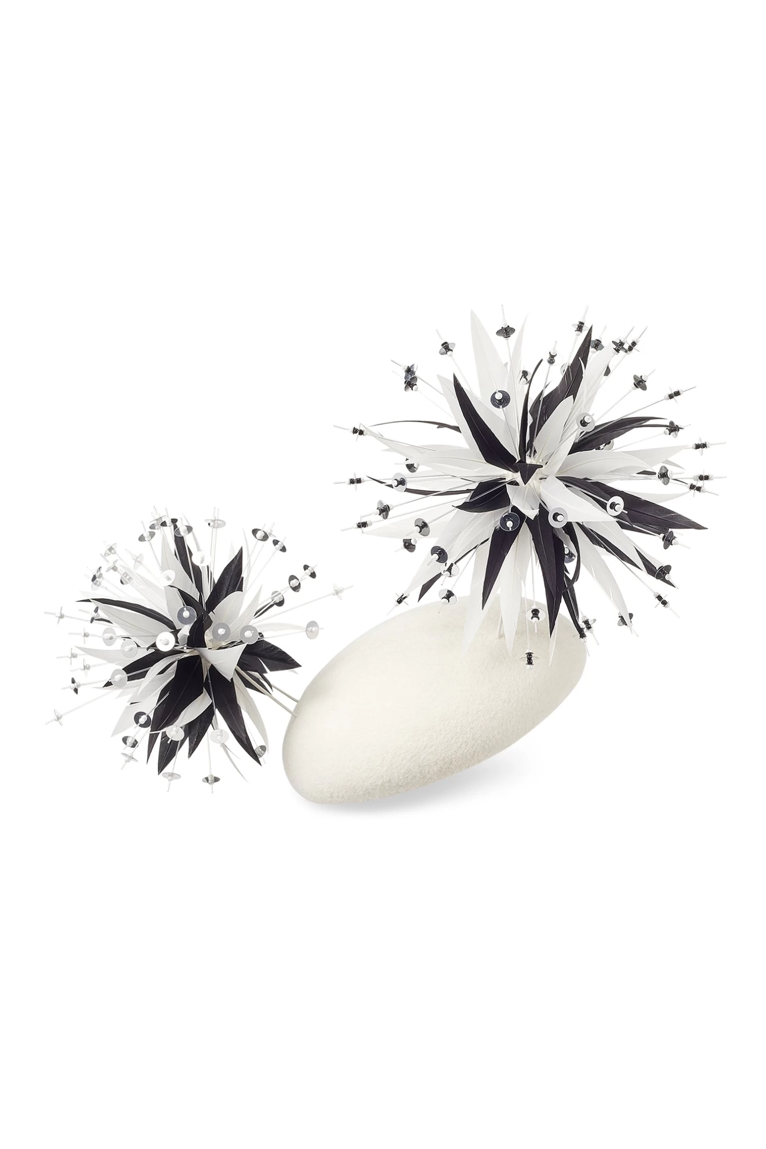 The Harlow white button is made from butter-soft velour felt. It’s adorned with two dramatic hand-cut goose feather and glittering sequin pom poms.